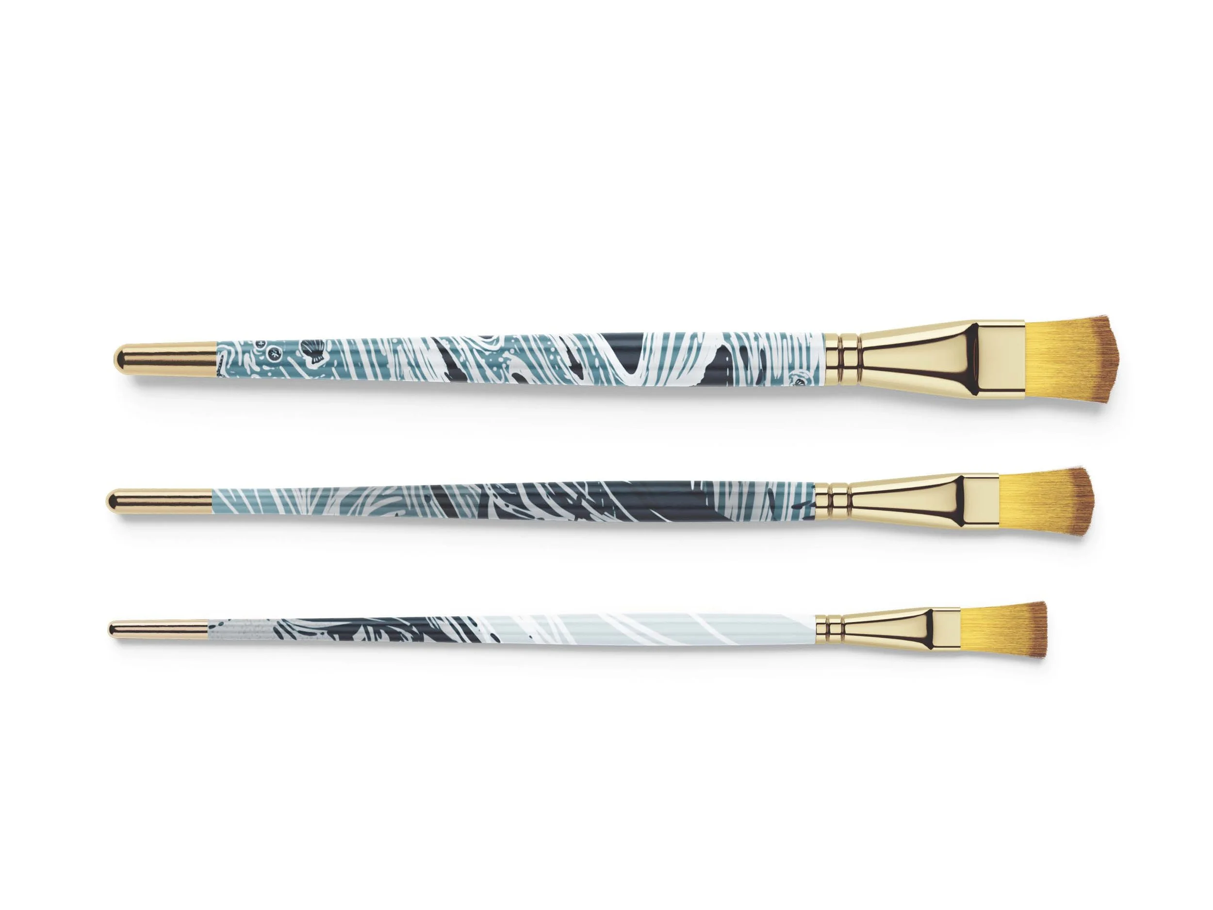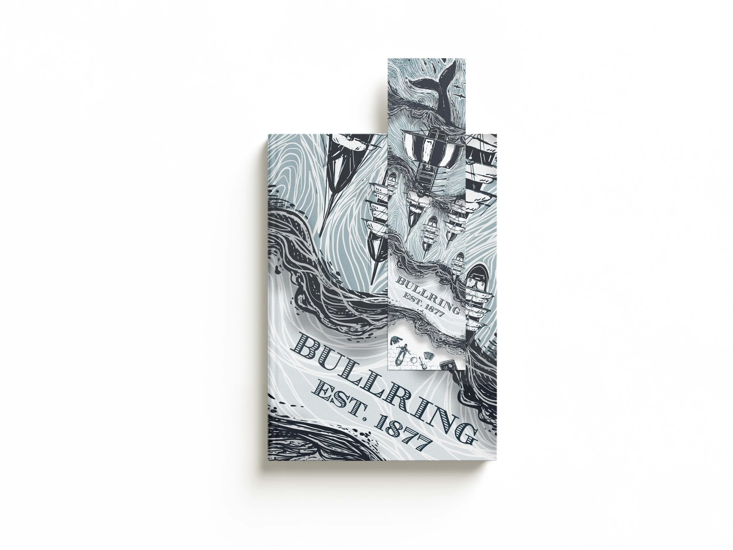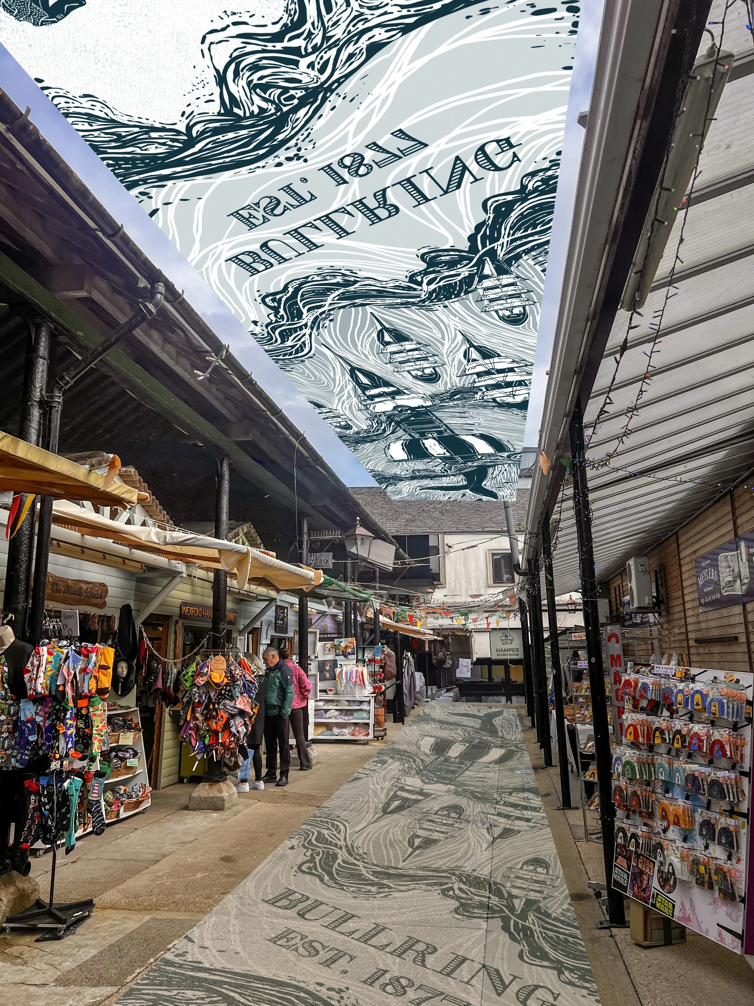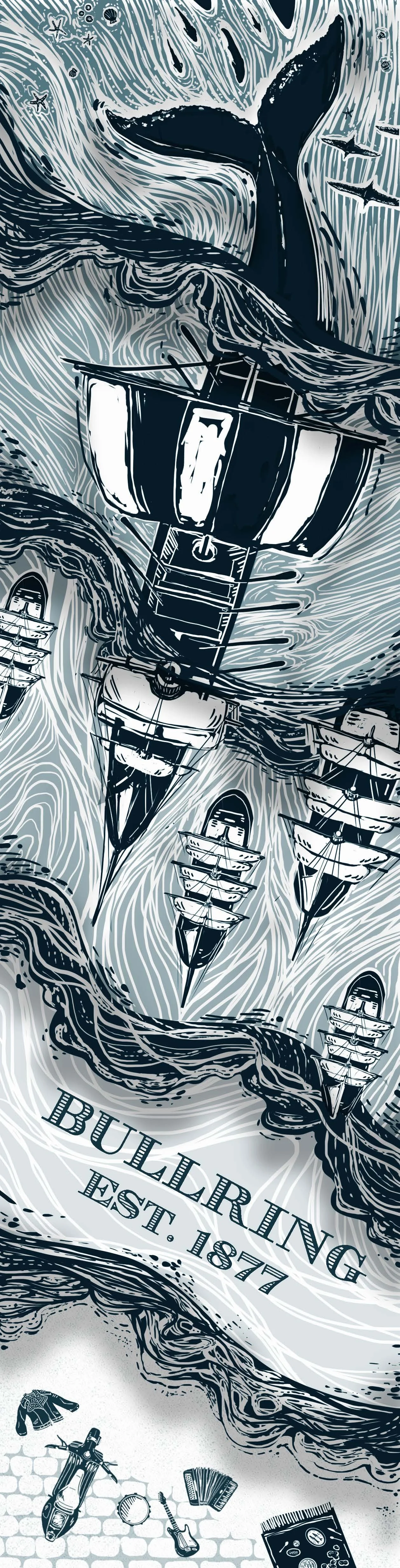 The space installation reflects a woodcut drawing style in a deep tattoo blue. The blue and woodcut style are to reflect both the styles and colors found in waves and the idea of memory and story tattooed on a place.